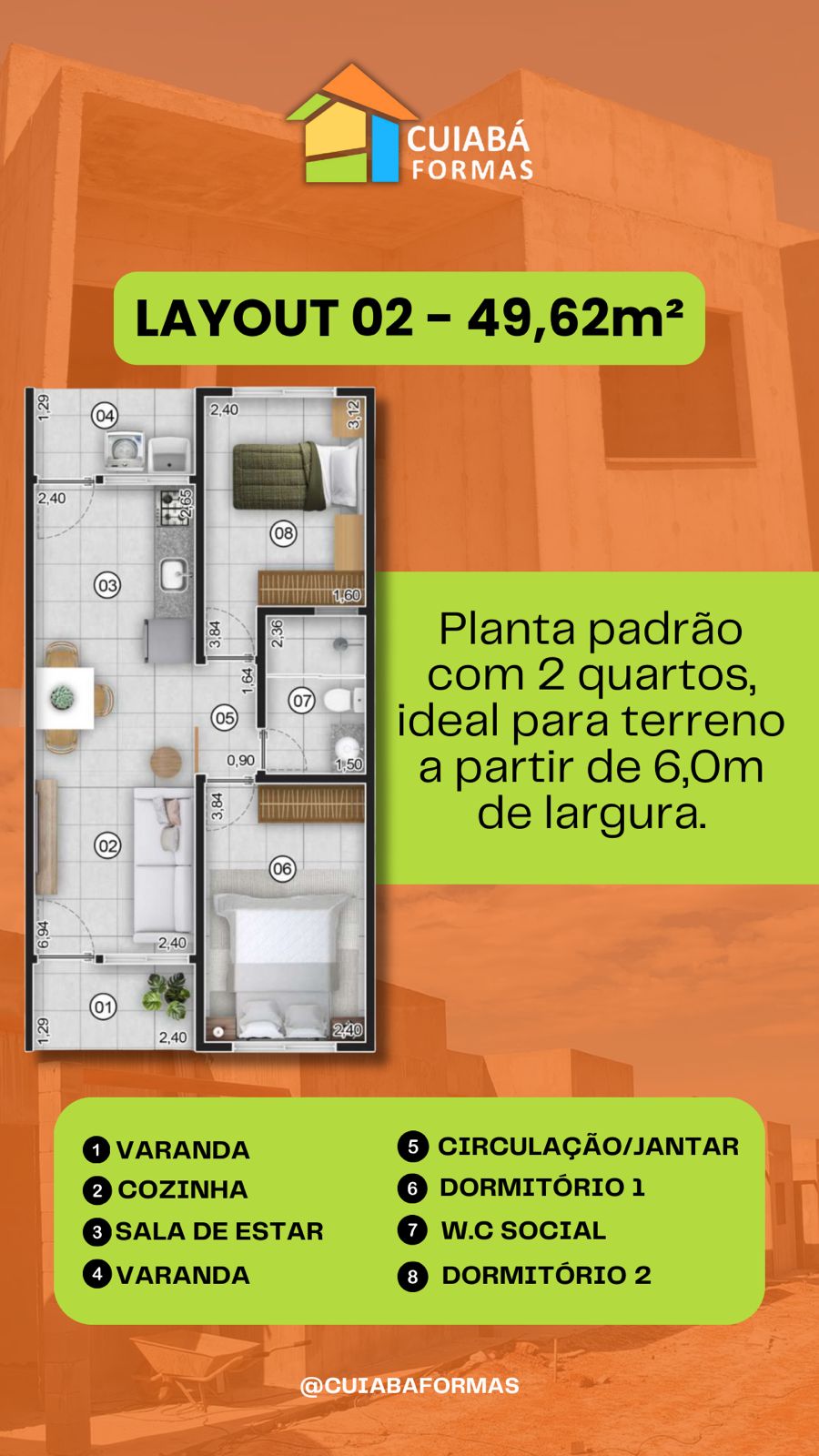 Ideal para terreno a partir de 6,0m de largura